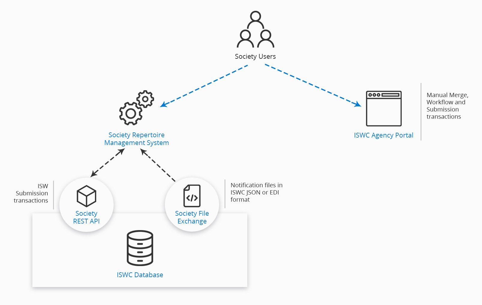 The recommended approach for integrating with the new ISWC Database is to use the REST based API. This API was launched as part of the ISWC modernization project in July 2020. This approach is the only supported approach for those societies still assigning ISWCs from a local range after 1st January 2020.