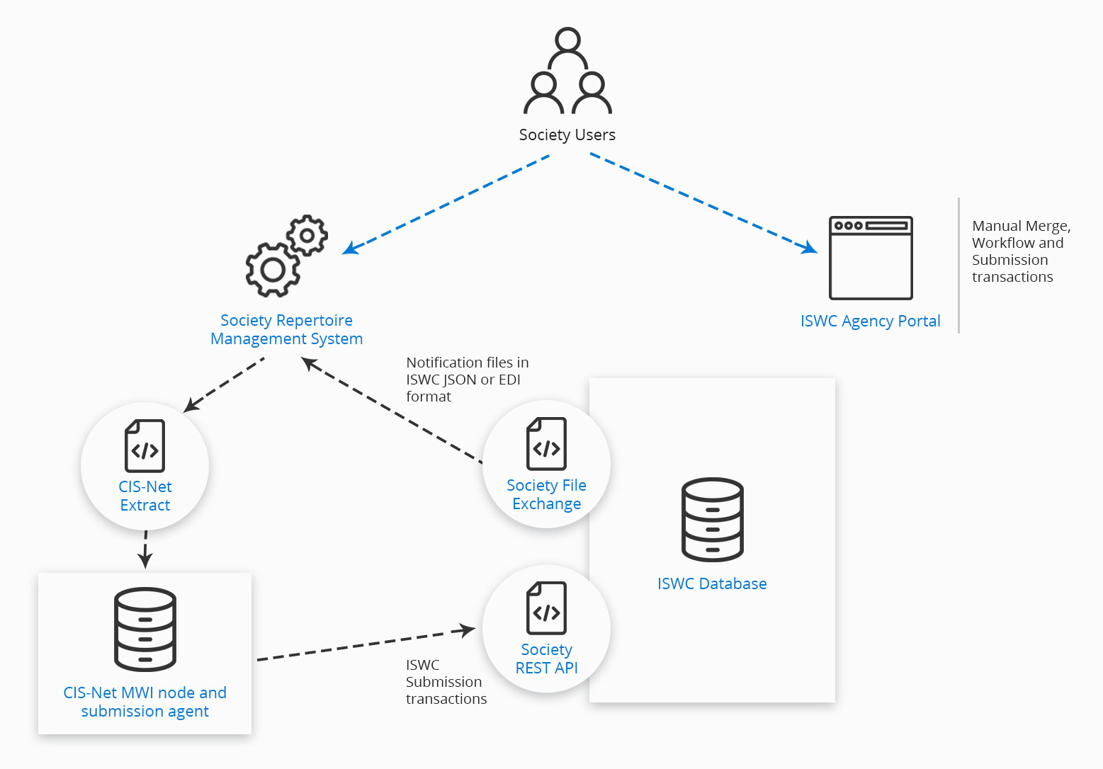 Other societies can make changes to ISWCs and associated metadata for works in your repertoire management system. These changes are made available in Notification files from the ISWC Database. These files should be ingested to ensure your repertoire management system is in-synch with the ISWC Database. Notifications are available in three supported file formats: ISWC JSON Format, ISWC Modern EDI Format and Existing EDI Format.